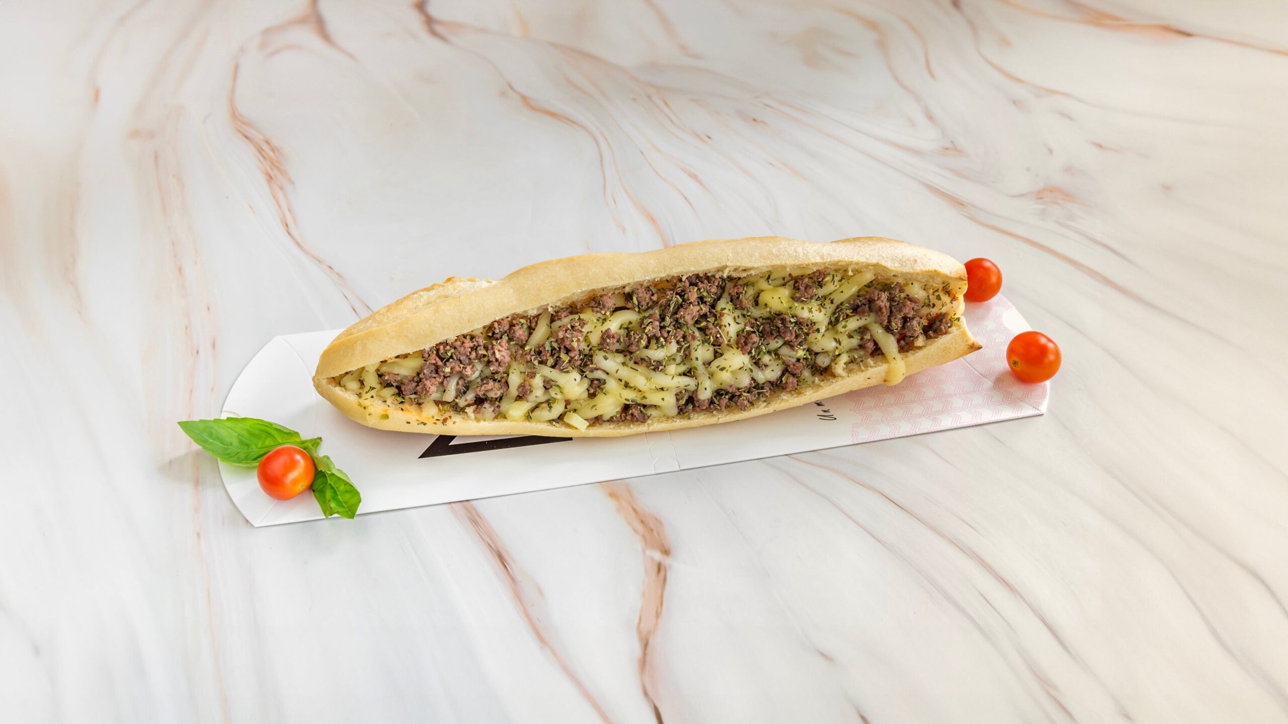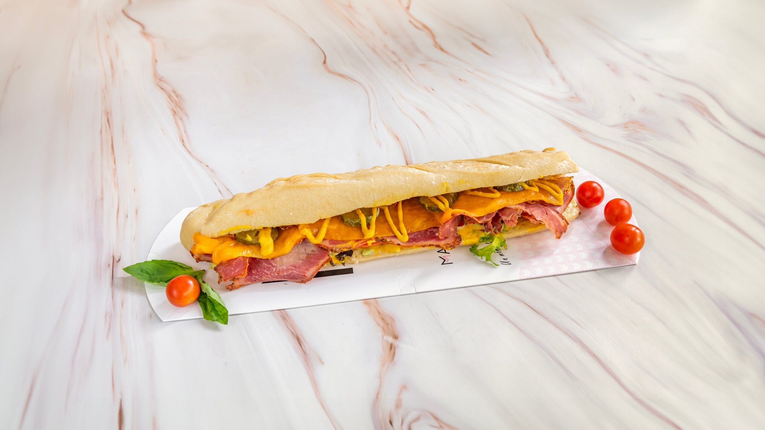 Pastrami, cornichons, mayonnaise, moutarde deli et cheddar fondu