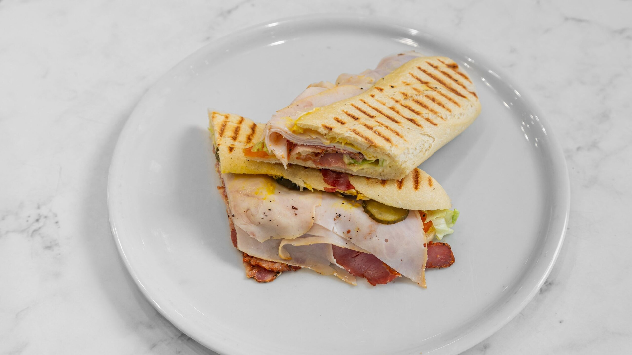 Pastrami, dinde, cornichons, salade, tomate, mayonnaise, moutarde