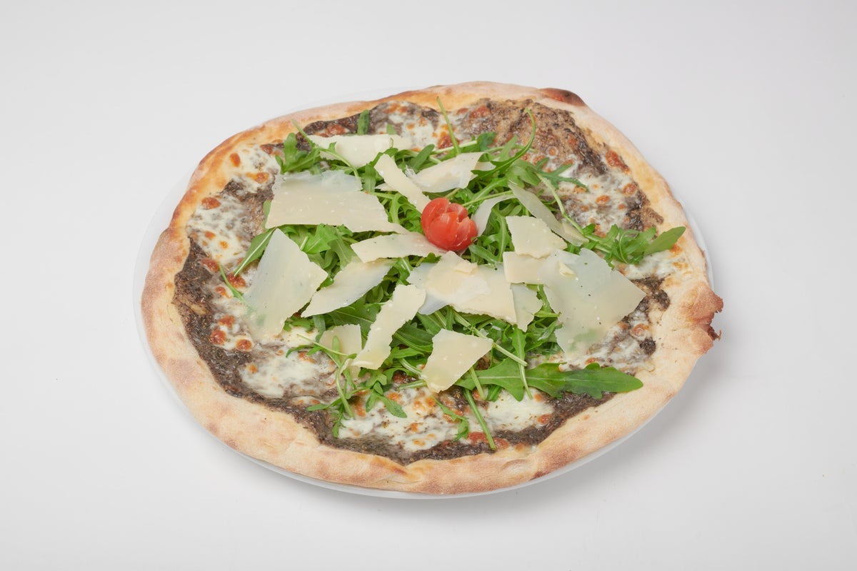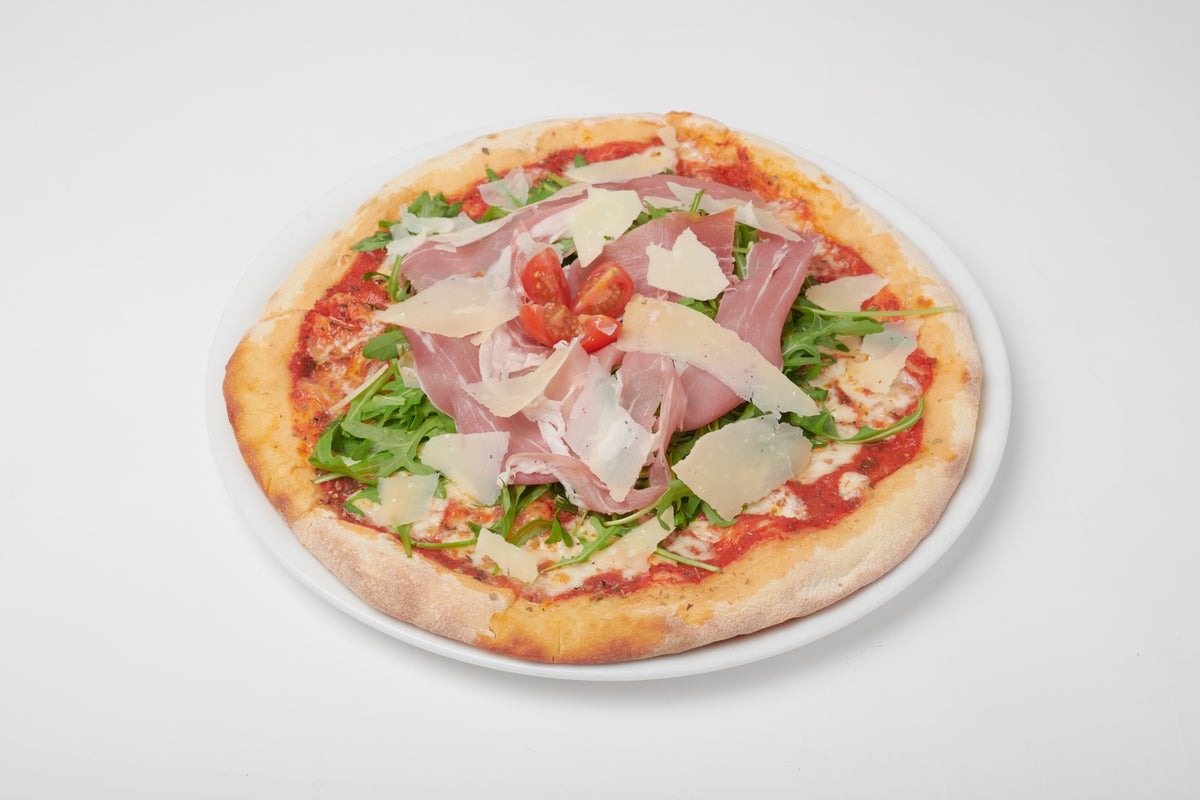 Tomate, mozzarella, jambon de parme, roquette, copeaux de parmesan